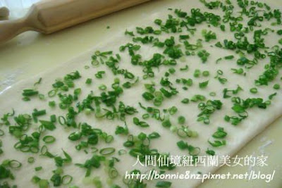 將發酵麵糰擀成長薄片,刷上油,灑上鹽,再灑上蔥。