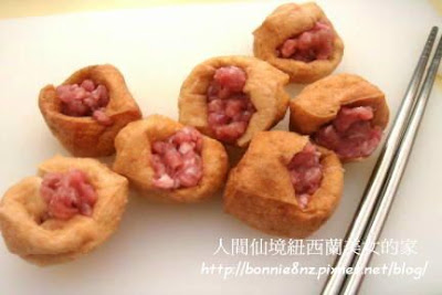把肉餡分成12等份,塞入油豆腐泡。