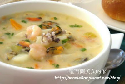 再加入綜合海鮮料和鮮奶拌勻煮約3分鐘至熟熱,