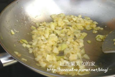 炒鍋加熱加入油,將洋蔥炒香,