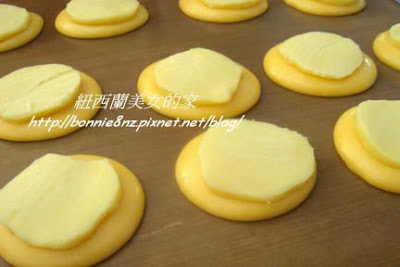 麵糊裝入擠花袋,擠約56cm圓型,在麵糊上放上切片的菠蘿皮。